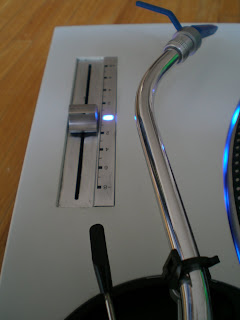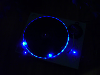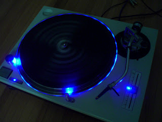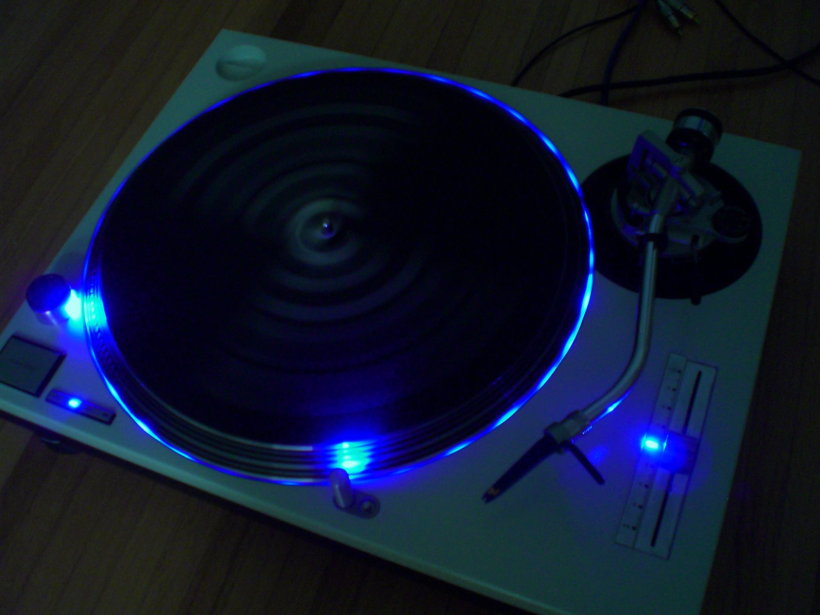 When I lived in Vancouver BC I used to service Technics turntables. Eventually my friend Paul "Swytch" of Trillbass fame (back then he lived in Vancouver too) sold me a beat-up Tech12 for cheap. I painted it white, gave it a new tonearm and pitchfader, recalibrated it and put new RCA cables in. I changed all the LEDs to blue ones. The special gimmick are 32 blue LEDs that illuminate the platter from underneath. The lights come on when you activate the popup-light. The effect is subtle in daylight but looks stunning in the dark. It was sold to someone somewhere in the US-